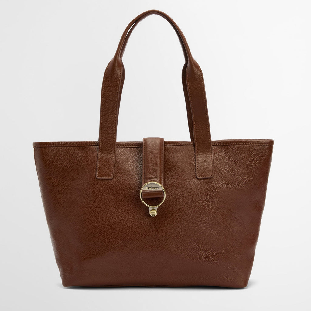 Previous NextSoftly constructed Barbour leather shoulder tote bag with matte gold effect branded turn lock closure, grab handles and trim.