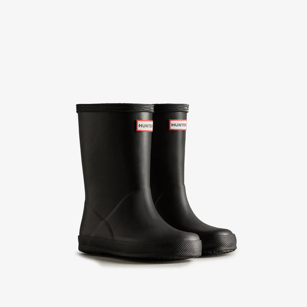 The Kids First Classic Rain Boot is perfect for puddle splashing. Handcrafted from natural rubber, a flat sole and rounded toe gives little feet room to move and the updated 100% recycled polyester lining ensures complete comfort for every adventure. These kids black welly boots are fully waterproof and feature a specially developed tread to reduce slipping. We recommend that all Hunter boots be worn with socks to protect the wearer's skin from contact with rubber.